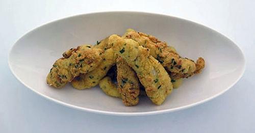 Tiras de pollo marinadas con hierbas y limón, rebozadas en harina de maíz.