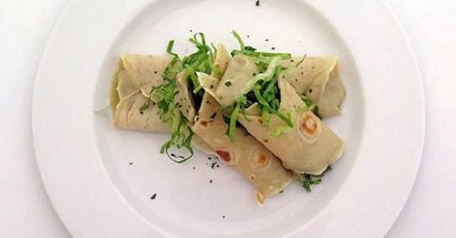 Ligeras crepes rellenas con puré de berenjenas y queso fresco.